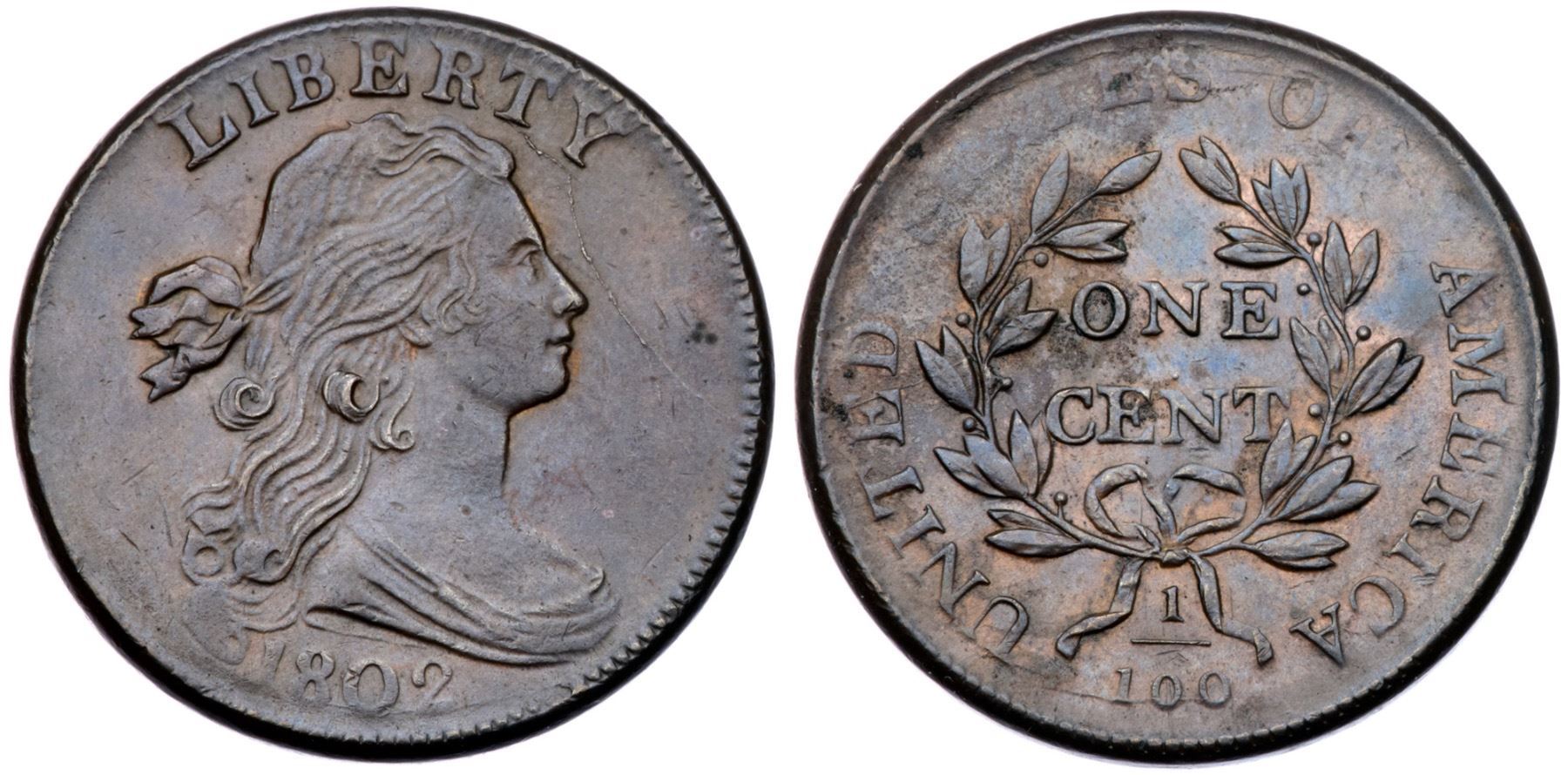 1802 S-231 R-1 Stemless Wreath EF45Glossy steel brown and chocolate with frosty lighter brown and tan in protected areas. Smooth surfaces with trivial marks including a few ticks left of the lower curls. Nicely struck except for the lowest curl and STATES, which are weak. LDS, Breen state VIII, with die cracks and clashmarks on both sides. Graded EF45 net VF35 and tied for CC#19 in the Noyes census, his photo #39045.Certificate Number: Pedigree: Ex ANS Museum Collection (as part of the legal settlement with Naftzger) 2001-R. E. "Ted" Naftzger, Jr. (via William C. Noyes)-Fred H. Borcherdt Collection