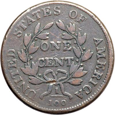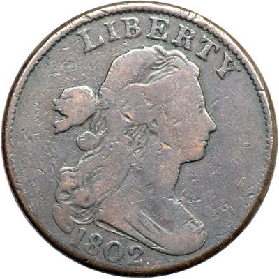 1802 S-231 R1. VG-8. Stemless Wreath. Glossy chocolate brown and steel. No roughness or verdigris and only a few contact marks, including a dull nick just left of the ribbon knot at the bottom of the wreath. This would be an unremarkable cent except for the die state. Very early die state, before Breen state I, without any die clashmarks on the reverse. The date and legends are complete and strong, and the stemless wreath feature is clear.