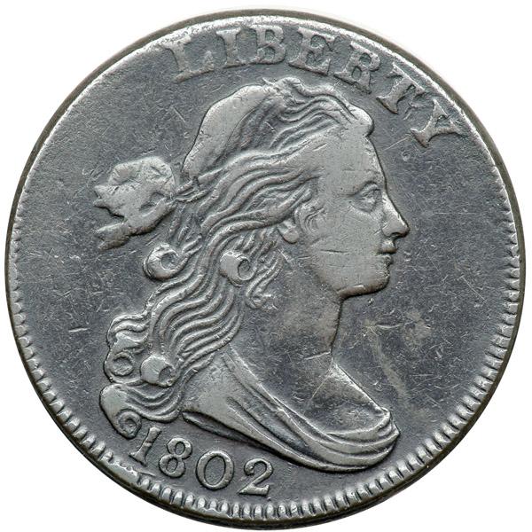 1802 S-232 R1 VG10. Sharpness VF20 but the reverse is covered with fine granularity. The obverse is smooth and nearly choice. No verdigris and the only mark is a shallow rim bruise over the F in OF. Olive brown and chocolate with slightly lighter steel brown toning covering the highpoints. The obverse is glossy while the reverse is closer to matte. MDS.