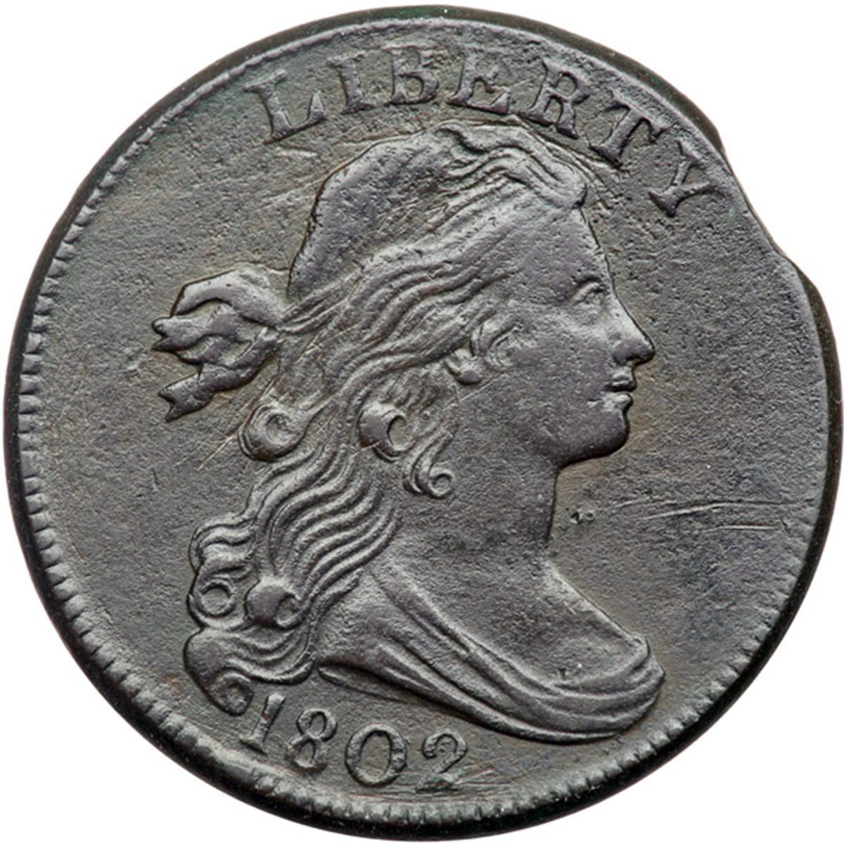 1802 S-233 R2 F15. Clipped Planchet. Sharpness EF40 but covered with very fine granularity under a mostly glossy dark olive brown patina. There is waxy verdigris in protected areas, especially on the reverse, plus a few old, light scratches under the date and above the head. A curved planchet clip affects the dentils over Y and to the right plus the opposing ones over RIC, as struck.