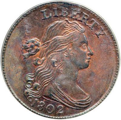 1802 S-234 R3 The "Dripping Paint" variety. PCGS graded MS-67 Red & Brown. Noyes Plate Coin. Highly lustrous bluish steel brown with faded mint red covering about 25% of the obverse, only traces of mint color remaining on the reverse. No spots or stains, only a light nick on the shoulder and a tiny hairline scratch in the drapery above the 2 from flawless. MDS, Breen die state IV. There is a shallow retained cud break over the B in LIBERTY but crumbling has not formed on the lower leaf below CA in AMERICA. Called MS65 "gem" and finest known in both census lists, Noyes photo #21323. Our grade is MS65. A fabulous gem cent with outstanding eye appeal. Plated in the Noyes book to illustrate the variety. Frequently exhibited at ANA Conventions many years ago by Howard Newcomb, who considered this to be "the most beautiful early cent." In the Newcomb sale catalog written by James G. Macallister, he said, "We could write a full page and not do justice to the beauty of this cent." That sentiment certainly holds true today. In fact, this piece is a serious candidate for the finest Draped Bust large cent of any date or variety. PCGS Population 1; The only example graded at PCGS for the variety. DWH #2828.