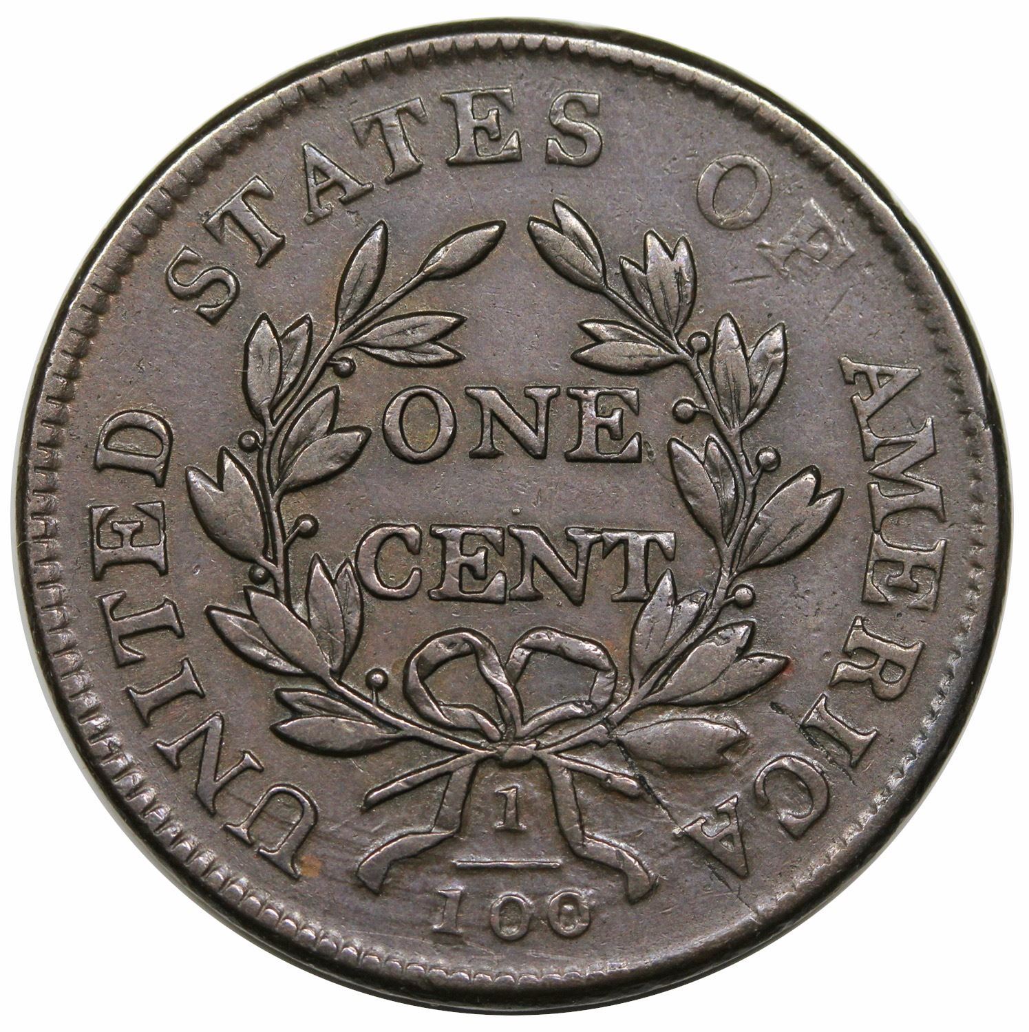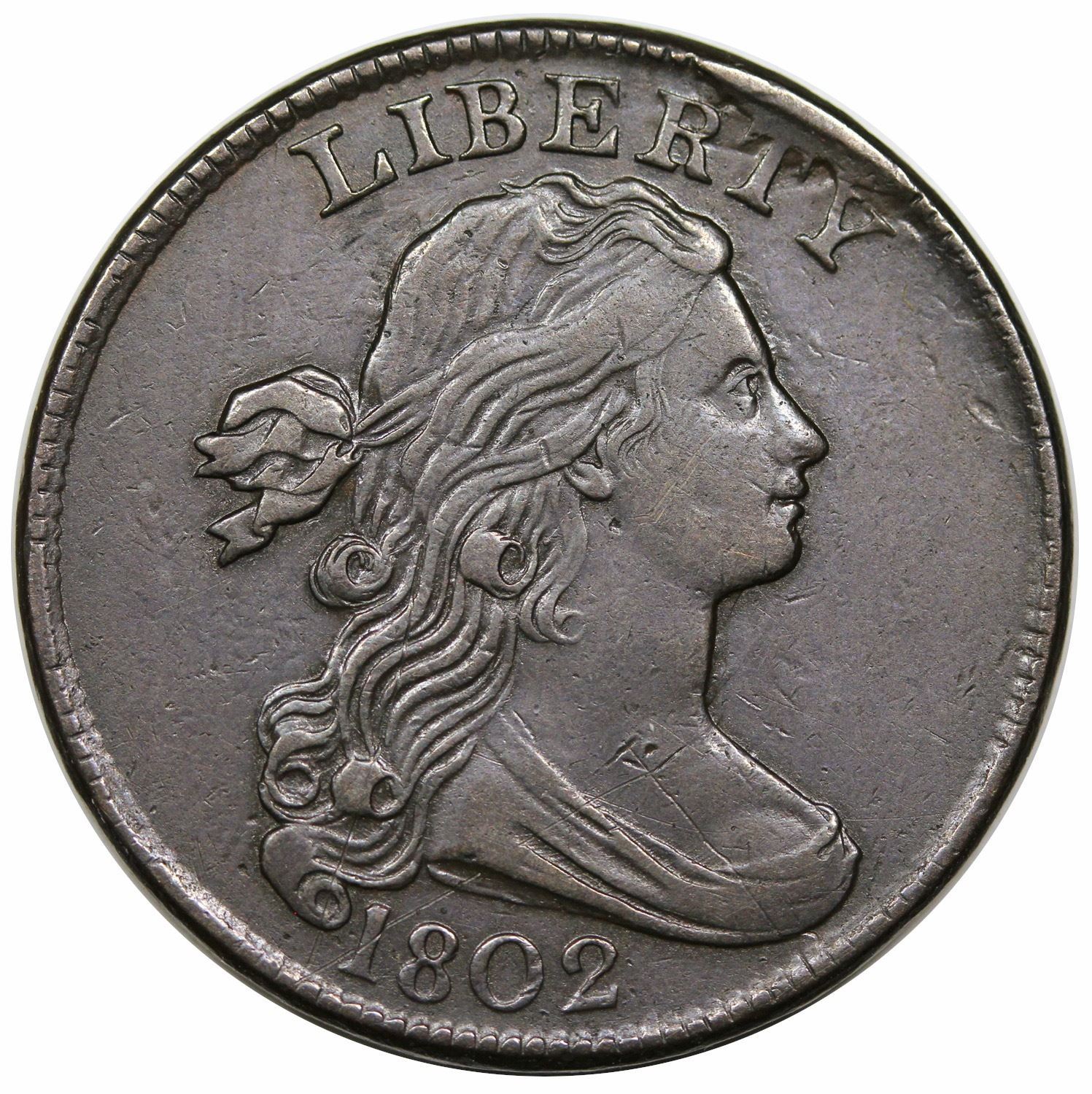 Close to XF detail and has a smooth, sharp appearance. Deduction for a few thin scratches across the lower bust and hair, as well as a spot of removed corrosion under the L of LIBERTY. The reverse is nearly choice with only a single scratch at the right stem. Pleasing color, an even, medium olive brown and steel. An impressive example despite the minor flaws, and is not far outside the condition census. M-LDS, Breen V.