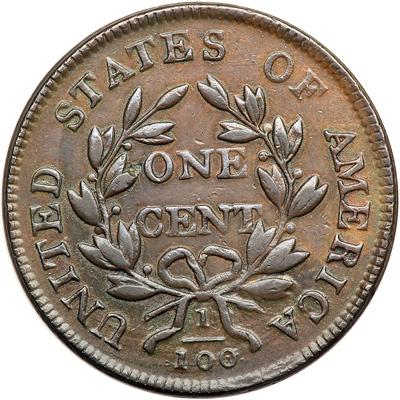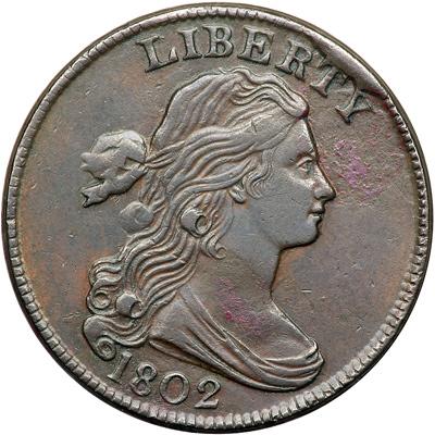 1802 S-235 R3+. VF-35. Sharpness EF45 with a small patch of very shallow reddish verdigris low on the neck and a slightly larger patch of similar crud at the eye and into the field at right. The reddish areas also show microscopic roughness but the remainder of the planchet is smooth and free of notable defects. Glossy chocolate and steel brown with some lighter brown toning in protected areas, especially on the reverse. M-LDS, Breen state V, with a rim cud at RTY that covers the top of the T and part of the left top of the Y. Called EF40 and tied for CC#10 in the Bland census. Noyes says EF45 net VF35 and CC#9 (but CC#3 of those known with the cud at TY), his photo #22986. DWH #2553.