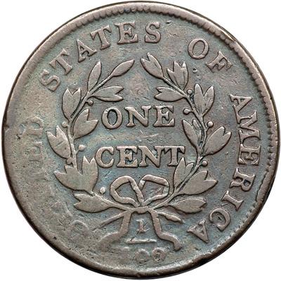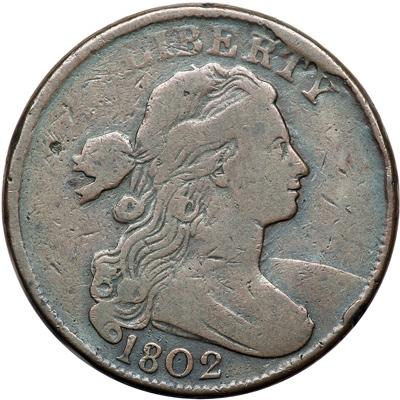 1802 S-235 R3+. VG-10. Glossy light olive and chocolate brown with hints of bluish steel overtone. The surfaces are smooth, free of any hint of corrosion or verdigris, and there are some light contact marks consistent with the grade. These marks include a small chip or round nick in the field left of the hair ribbon, a very light rim bruise left of the date, and a small rim bruise above the bust tip. Extremely rare TDS, Breen state VII, with a strong die crack from the rim to the neck and the area below the crack clearly raised above the plain of the field above the crack. The fine reverse die crack associated with this die state as described in the Breen book is present but quite faint. The earlier cud break at RTY is strong. Noyes graded VG10 net VG8, his photo #23389. In spite of the relatively low grade, this example is tied for finest known honors of the terminal die state. DWH #2554.