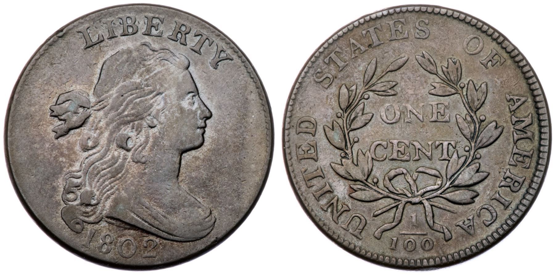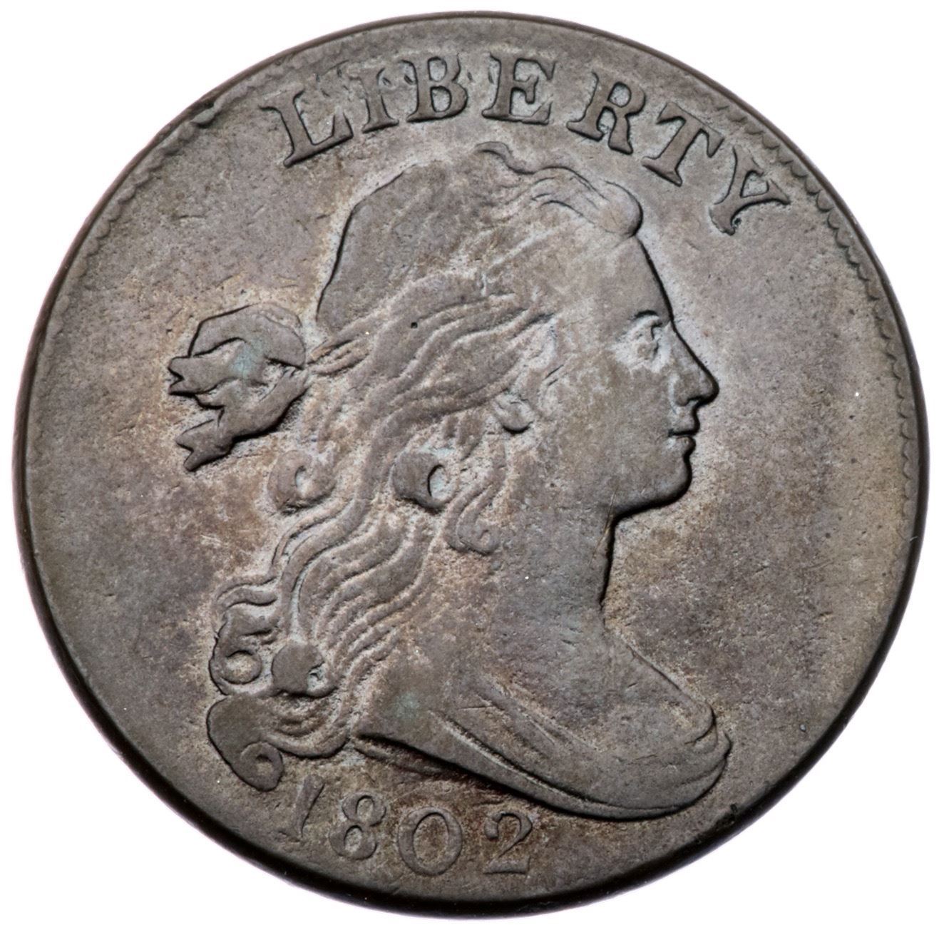 1802 S-238 R-4 F15+Slightly sharper with very nice eye appeal, but a glass reveals extremely faint roughness in the obverse fields. No verdigris and just a couple trivial marks including a small rim nick left of the L and a thin vertical nick at the left foot of the N in ONE (which is very easy to miss). Glossy steel brown and light olive blending to medium chocolate in protected areas. This cent has nice eye appeal for the grade. Rare EDS, Breen state I early, with an uncracked reverse. Graded VF20 net F15 and tied for CC#19 in the Noyes census, his photo #26172. To the best of our knowledge this is the finest example with an uncracked reverse. Comes with a nice provenance.Certificate Number: Pedigree: Ex Oscar J. Pearl, Numismatic Gallery 1944 FPL, lot 175 (plated)-Charles M. Williams, Numismatic Gallery 11/14/1950:201-unrecorded 3/1982-Fred H. Borcherdt Collection