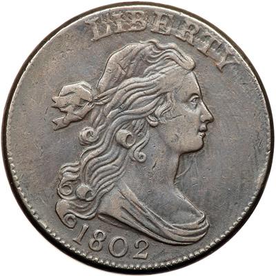 1802 S-238 R4. VF-30. Plated in Early American Cents and Penny Whimsy. Glossy light chocolate brown with slightly lighter brown toning over the T in CENT thanks to a collection of tiny contact marks in that area. The only additional contact mark worthy of mention is a very light rim bruise opposite the neck. MDS, Breen state III, with a fine die crack through the top of STATES. The reverse is plated in Early American Cents and Penny Whimsy. Called EF40 net VF30 and tied for CC#1 in the Noyes census, photo #ANS1442. Bland says VF25 and tied for CC#5. Removed from a PCGS slab graded XF45 (PCGS label included, and it shows the attribution and Husak provenance). PCGS Population 1; The only example graded at PCGS for the variety. DWH #3491.