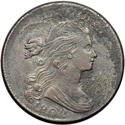 1802 S-238 R4. VG-8. Sharpness VF35 but corroded, the roughness ranging from nonexistent to severe. The roughness is strongest at LIBERTY, which is mostly obliterated, while there are areas on the reverse that are smooth and glossy. No verdigris and only a few light contact marks that are well hidden in the roughness. Partially glossy mix of chocolate, dark steel, and olive brown with hints of silvery steel toning in some of the rough areas. Extremely rare terminal die state, later than Breen’s final state V, with a clear cud break joining TATE to the rim above. Breen speculated that this cud might exist, but he never saw one. There are at least 2 known today. The bottom of the date is weakly struck thanks to the cud on the opposing side that gathered up much of the planchet thus keeping it from properly filling the obverse details. LIBERTY is mostly gone due to the roughness but everything else is clear. Removed from an NCS slab graded EF details corroded (NCS label included, and it shows the attribution and Reiver provenance). DWH #2884.