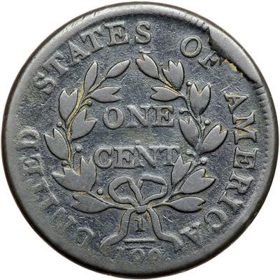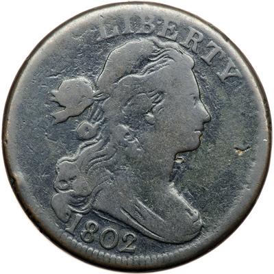 1802 S-241 R1 Stemless Wreath with Double Fraction Bar. VG-7. Glossy dark olive brown with steel highpoints. There are traces of shallow verdigris caked into the protected areas and the surfaces are not perfectly smooth, but they are acceptable for the grade. There is a dull rim nick left of the lower curls and a small planchet chip in the field near the dentils off the chin. The date is strong and the legends are clear, including the stemless wreath and double fraction bar features. M-LDS, Breen state IV, with a strong cud break connecting the top of the F in OF to the dentils above the adjacent A. Removed from an NCS slab graded "VG details, environmental damage," and the NCS label is included. DWH #2570.