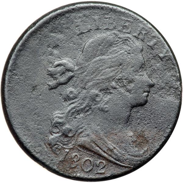 1802 S-242 R2 G6. Struck 30% Off Center. Sharpness VF25 but dark and covered with fine to moderate granularity. In addition, there are a half dozen patches of deeper planchet erosion on the obverse, the deepest of these on the upper edge of the bust. Slightly glossy very dark steel and olive, nearly black. Struck 30% off center to K-3. An ugly cent but a dramatic mint error.