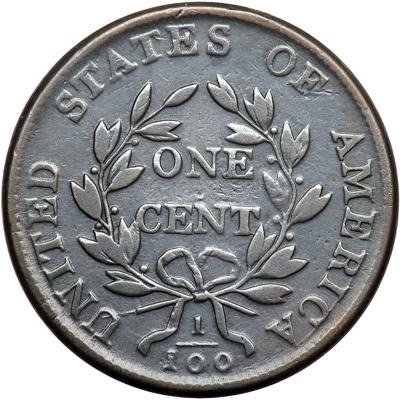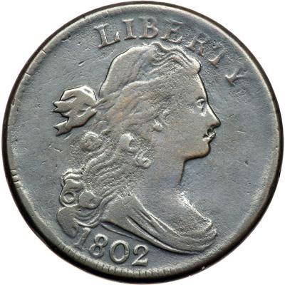1802 S-242 R2. VG-8. Sharpness F12 with patches of very fine roughness at the forehead and in the hair over the shoulder. No verdigris. The only marks are a dull nick on the upper lip and some faint hairline scratches in the field before the face. Recolored glossy dark steel. Date and legends strong. Looks better than it sounds. LDS, Breen state III. Dull die clashmarks show on the obverse and a crack passes from the rim through the tops of NIT to the left top of the E and up to the rim over the E. In addition, the chin and lips show a fine but clear double profile from die bounce. DWH #0286.