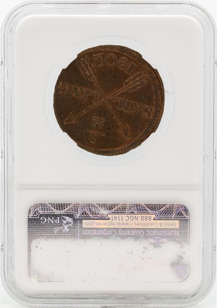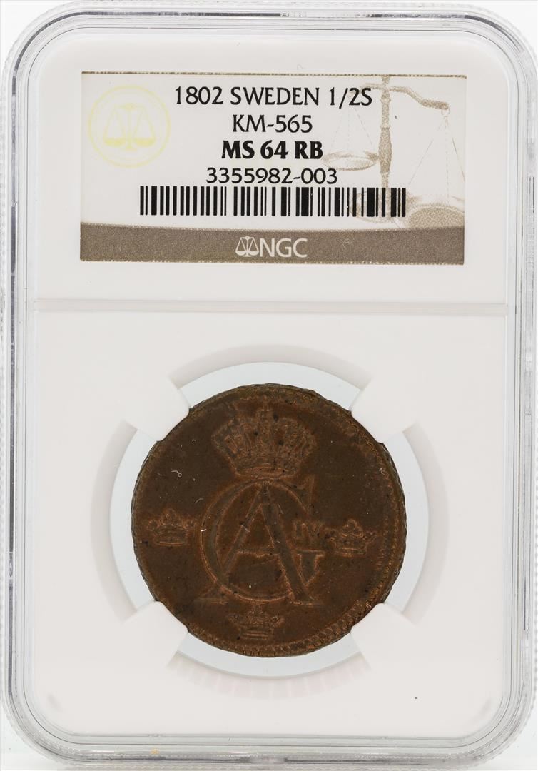 One 1802 Sweden 1/2 Skilling Coin NGC MS64RB. NGC Certified.