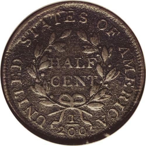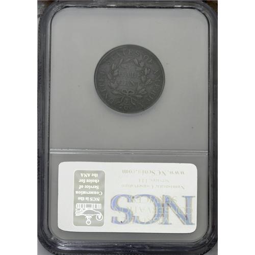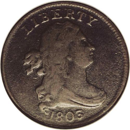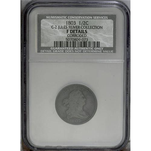 <B>1803<1/2 C> C-2, B-2, High R.4. Die State 7--Corroded--NCS. Fine Details. VG8 EAC.</B></I> Close date, 03 crowded; Wide fraction. The die state normally seen with a full rim break over STAT. This is clearly the rarest 1803 variety, although its rarity has diminished over the years. Currently considered Rarity-4+, at one time it was thought to be extremely rare. Walter Breen stated: "This variety was for long believed an extreme rarity. Most of the examples which lowered it first to R-6 and then to R-5 were cherrypicked in the last two decades by specialists, and a sizable minority were perfect die coins mistaken for No. 1 or unattributed by their owners." Most of those recent finds are in low grades. The finest known is still XF, followed by four VF grade coins, and then down to Fine and below.<BR> Although considered VG8 overall by specialists, this example is still probably in the top 10% of those known. The devices are medium brown with darker color in the fields. Both sides are covered with light porosity, but there are no other significant imperfections. The surfaces may have been lightly burnished at one time.<BR><I>Ex: Daru Coin Co. (1/1979); Jim McGuigan (4/17/1987).</B></I> Envelope Included.