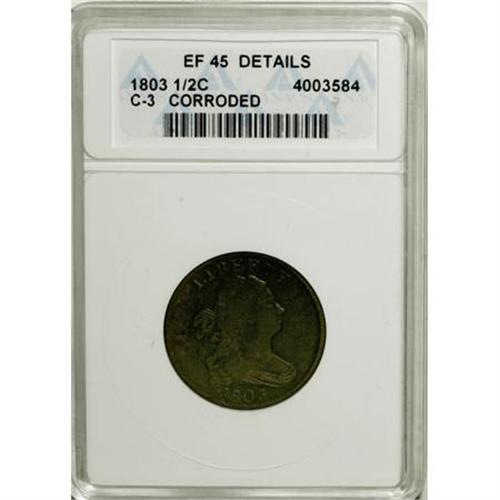 <B>1803 1/2 C --Corroded--ANACS. XF45 Details.</B></I> C-3. NGC Census: (7/43). PCGS Population (12/40). Mintage: 92,000. Numismedia Wsl. Price for NGC/PCGS coin in XF45: $874. (#1060)<BR><BR><B>Coin Engraver:</B> Robert Scot<BR><BR><b>Shipping:</b> Coins & Currency (<a target="_blank" href="http://www.heritageauctions.com/common/shipping.php">view shipping information</a>)