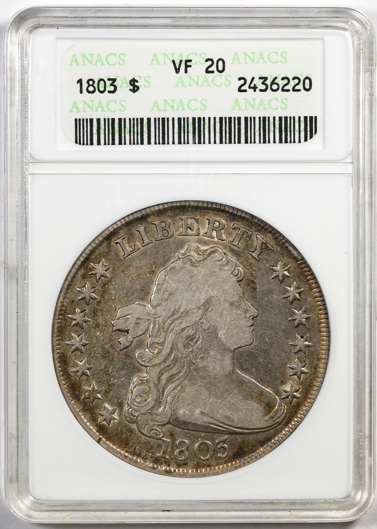 One 1803 $1 Draped Bust Silver Dollar Coin ANACS VF20 Old Soapbox Holder. ANACS Certified.