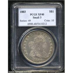 <table><tr><td><TABLE cellSpacing=0 cellPadding=0 width="100%" bgColor=#000000 border=0><TBODY> <TR><TD width="100%"><TABLE cellSpacing=1 cellPadding=3 width="100%" border=0><TBODY><TR><TD width="100%" bgColor=#79735c><FONT face=arial color=#ffffff size=3><B>Description</B> </FONT></TD></TR><TR><TD width="100%" bgColor=#ffffff><FONT face=arial size=2><B>1803 $1 Large 3 XF40 PCGS.</B></I> B-6, BB-255, R.1. Golden-brown and lilac patina enriches this untroubled and nicely detailed Bust Dollar. The only Bolender variety with a Large 3 logotype, aside from the extremely rare novodel proof. The eagle's shield has a couple of relatively innocuous adjustment marks, as made, although a short pinscratch is noted below the I in UNITED. Pale luster clings to the stars and legends. The dies are somewhat rotated counterclockwise. </FONT></TD></TR></TBODY></TABLE></TD></TR></TBODY></TABLE><BR><A name=PricesRealized></A><TABLE cellSpacing=0 cellPadding=0 width="100%" bgColor=#000000 border=0><TBODY><TR><TD width="100%"><TABLE cellSpacing=1 cellPadding=3 width="100%" border=0><TBODY><TR><TD width="100%" bgColor=#79735c><A name=PR><FONT face=arial color=#ffffff size=3><B>Previous Prices from Heritage Auctions</B> </FONT></A></TD></TR><TR><TD bgColor=#f6f6ed><TABLE cellSpacing=0 cellPadding=0 width="100%" border=1><TBODY><TR><TD align=middle width="33%"><B>Date</B></TD><TD align=middle width="33%"><B>Service</B></TD><TD align=middle width="33%"><B>Price</B></TD></TR><TR bgColor=whitesmoke><TD width="33%"><B>09/28/2002</B></TD><TD width="33%">NGC</TD><TD width="33%">$1,897.50</TD></TR><TR bgColor=whitesmoke><TD width="33%"><B>01/01/1996</B></TD><TD width="33%">NGC</TD><TD width="33%">$990.00</TD></TR></TBODY></TABLE></TD></TR><TR><TD bgColor=#ffffff><FONT face=arial size=1 ?>PLEASE NOTE: All prices realized reflect the final hammer price PLUS the buyer's premium in auctions that charge a buyer's premium. Each item has a notation at the top of the listing indicating whether that lot included a buyer's premium. Example: A item that sells with a final hammer price of $100 and a 20% buyer's premium will display with a price realized of $120. All information listed is intended to be as accurate as possible, but errors are possible. Please use this guide carefully and inform us of any inaccuracies. </FONT></TD></TR></TBODY></TABLE></TD></TR></TBODY></TABLE><BR><TABLE cellSpacing=0 cellPadding=0 width="100%" bgColor=#000000 border=0><TBODY><TR><TD width="100%"><TABLE cellSpacing=1 cellPadding=3 width="100%" border=0><TBODY><TR><TD width="100%" bgColor=#79735c colSpan=6><FONT face=arial color=#ffffff size=3><B>Price Guide*</B> </FONT></TD></TR><TR bgColor=#f6f6ed><TD align=middle><B>Grade</B> </TD><TD align=middle><B>Coin World<BR>(Trends)</B> </TD><TD align=middle><B>Numismedia<BR>Retail</B> </TD><TD align=middle><B>Numismedia<BR>Wholesale</B> </TD><TD align=middle><B>Coin<BR>Universe</B> </TD><TD align=middle><B>Heritage<BR>Value Index</B> </TD></TR><TR bgColor=#ffffff><TD align=middle>35</TD><TD align=right>---</TD><TD align=right>---</TD><TD align=right>---</TD><TD align=right>---</TD><TD align=right>$1,969.38</TD></TR><TR style="FONT-WEIGHT: bold" bgColor=#cccfdd><TD align=middle>40</TD><TD align=right>$3,250.00</TD><TD align=right>---</TD><TD align=right>---</TD><TD align=right>$3,250.00</TD><TD align=right>$2,281.67</TD></TR><TR bgColor=#ffffff><TD align=middle>45</TD><TD align=right>$4,000.00</TD><TD align=right>---</TD><TD align=right>---</TD><TD align=right>---</TD><TD align=right>$2,903.61</TD></TR><TR bgColor=#ffffff><TD colSpan=6><FONT size=1>*All information listed is intended to be as accurate as possible, but errors are possible. No item may be returned or refused based on this information which is provided as a service to our customers. You should contact each pricing source directly to determine the accuracy of this information. </FONT></TD></TR></TBODY></TABLE></TD></TR></TBODY></TABLE><BR><TABLE cellSpacing=0 cellPadding=0 width="100%" bgColor=#000000 border=0><TBODY><TR><TD width="100%"><TABLE cellSpacing=1 cellPadding=3 width="100%" border=0><TBODY><TR><TD width="100%" bgColor=#79735c><FONT face=arial color=#ffffff size=3><B>Population Guide</B> </FONT></TD></TR><TR bgColor=#ffffff><TD align=middle><!-- Begin Output of Population Grid--><TABLE cellSpacing=0 cellPadding=0 width="100%" border=0><TBODY><TR><TD vAlign=center><TABLE cellSpacing=0 width="100%" border=1 cellsadding="3"><TBODY><TR><TD vAlign=center><TABLE cellSpacing=0 cellPadding=3 width="100%" border=1><TBODY><TR><TD vAlign=center align=middle bgColor=#f0f1e8 colSpan=2 <CENTER><FONT face=Arial size=2><B>PCGS Pop </B></FONT><CENTER></CENTER></TD><TD vAlign=center align=middle bgColor=#f0f1e8 colSpan=2><CENTER><FONT face=Arial size=2><B>NGC Pop</B></CENTER></FONT></TD></TR><TR><TD vAlign=center><FONT face=Arial size=2>(40)</FONT> </TD><TD vAlign=center align=right><FONT face=Arial size=2>15</FONT> </TD><TD vAlign=center><FONT face=Arial size=2>(40)</FONT> </TD><TD vAlign=center align=right><FONT face=Arial size=2>0</FONT> </TD></TR><TR><TD vAlign=center><FONT face=Arial size=2>(>40)</FONT> </TD><TD vAlign=center align=right><FONT face=Arial size=2>27</FONT> </TD><TD vAlign=center><FONT face=Arial size=2>(>40)</FONT> </TD><TD vAlign=center align=right><FONT face=Arial size=2>0</FONT> </TD></TR></TBODY></TABLE></TD></TR></TBODY></TABLE></TD></TR></TBODY></TABLE><!-- End Output of Population Grid--></TD></TR></TBODY></TABLE></TD></TR></TBODY></TABLE><BR><TABLE cellSpacing=0 cellPadding=0 width="100%" bgColor=#000000 border=0><TBODY><TR> Important notice: Heritage usually auctions material at the rate of 200-250 lots per hour. On some occasions eBay Live bid software or the Internet may not be able to keep up with the pace of the auction. We recommend placing a realistic absentee bid now as insurance to avoid disappointment. Occasionally the auctioneer may eliminate or reject an eBay Live bid, and the auctioneer may also reopen a lot aft