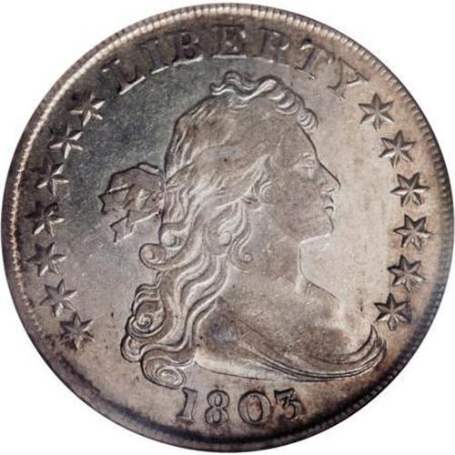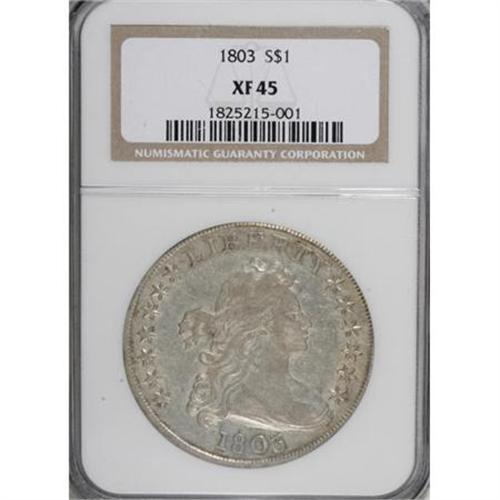 <B>1803 $1 Large 3 XF45 NGC.</B></I> B-6, BB-255, R.2. Luster fills the borders, curls, and plumage of this attractive Draped Bust dollar. Light, even wear is found on Liberty's cheek and shoulder. From the final year of circulation production, although novodel proofs of various dates were issued decades later.<BR><BR><B>Coin Engraver:</B> Robert Scot<BR><BR><b>Shipping:</b> Coins & Currency (<a target="_blank" href="http://www.heritageauctions.com/common/shipping.php">view shipping information</a>)