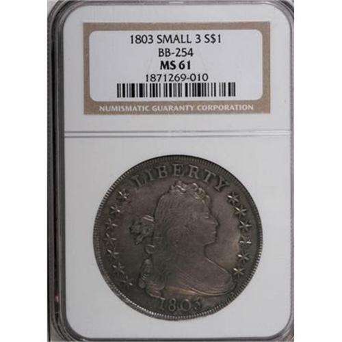 <B>1803 $1 Small 3 MS61 NGC.</B></I> B-4, BB-254, R.3. Die State I: perfect obverse die, mated with Reverse B (previously used to strike several 1801 and 1802 varieties, as well as BB-212 from 1803). This piece is sharply struck and lustrous, with rich original toning across both sides. A horizontal abrasion on Liberty's cheek is the only individually noteworthy surface mark on the obverse, while the reverse shows a shallow diagonal line across the upper right region of the shield. In 1993, Bowers noted in his silver dollar <I>Encyclopedia </B></I>that he did not know of any Mint State examples of this variety, but since then NGC has certified two coins as Uncirculated: this piece and another at MS63, as of (3/08).<BR><I>Ex: Stack's (10/2000), lot 1165</B></I>.<I> </B></I><BR><I>From The Queller Family Collection of Silver Dollars.</B></I><BR><BR><b>Shipping:</b> Coins & Currency (<a target="_blank" href="http://www.heritageauctions.com/common/shipping.php">view shipping information</a>)