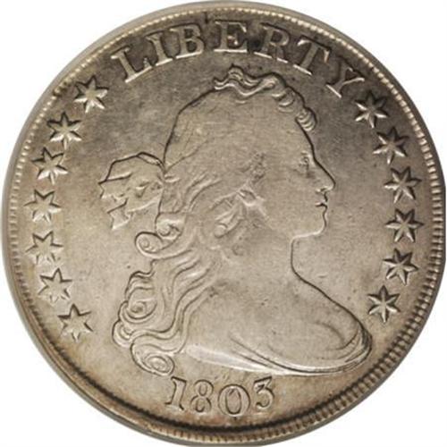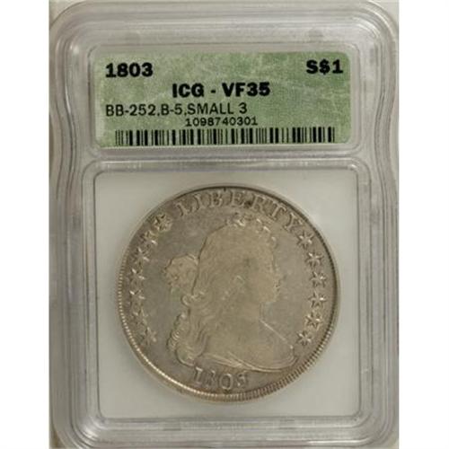 <B>1803 $1 Small 3 VF35 ICG.</B></I> B-5, BB-252, R.3. Luster shimmers across the borders, despite 25 points of wear on the central devices. Nearly all of E PLURIBUS UNUM is legible. An attractive and highly collectible slate-gray example of this scarcer <I>Guide Book</B></I> variety. The majority of 1803 dollars are from the B-6 Large 3 marriage.<BR><BR><B>Coin Engraver:</B> Robert Scot<BR><BR><b>Shipping:</b> Coins & Currency (<a target="_blank" href="http://www.heritageauctions.com/common/shipping.php">view shipping information</a>\)
