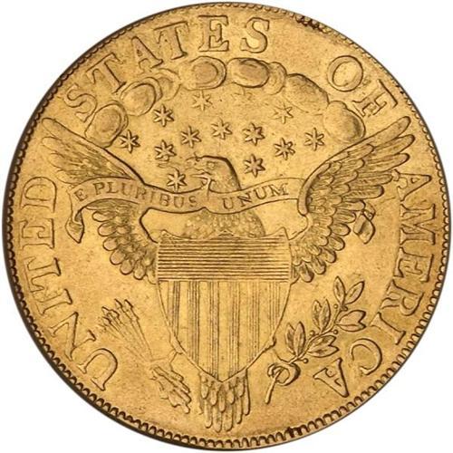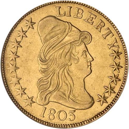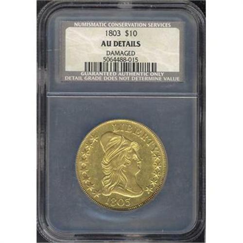 <b>1803 $10 Capped Bust. Small reverse stars. NCS graded About Unc Details. Damaged.</b> Although damaged, this is so slight that on first inspection it takes some doing to find anything amiss, the coin has a pleasing look to it that calls attention to its bold detail and lustrous condition. Whereas the high mintage 1799 and 1801 eagles are the two most plentiful early eagles around, this isn't the case with the lower mintage (15,017 pieces) 1803. Large and small reverse stars exist for this year <b>(PCGS # 8565)</b>