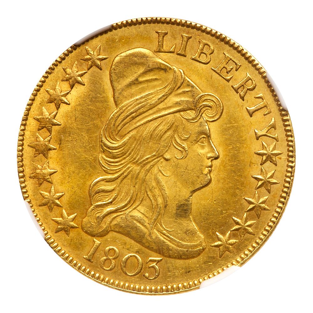 1803. Small reverse stars, BD-3, T-29, Rarity 4. NGC graded MS-63. Amazing quality for such an early Capped Bust, Heraldic Eagle gold 10 coin, with all the satiny freshness one could hope to find, as well as enticingly bold striking. The fields and devices are rather free of any handling issues, even adjustment marks are nowhere to be found. Quite a treat on these large early gold pieces! The eye appeal is quite high, and this is one of the finer examples of this date--and type--to survive. If you demand top quality and bold visual appeal, then look no further than this gorgeous piece! Lightly toned.