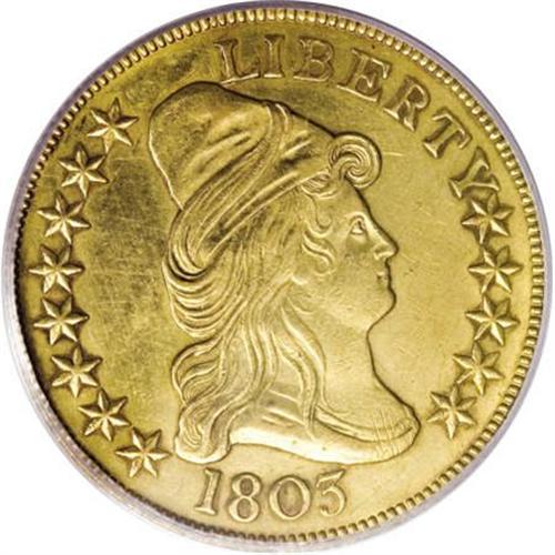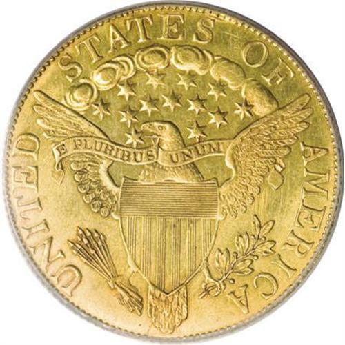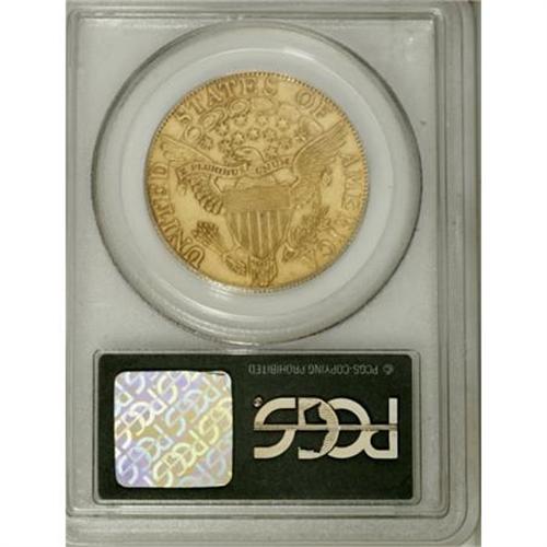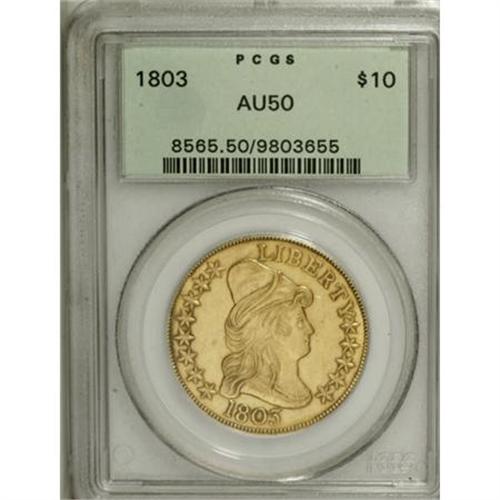 <B>1803 $10 Extra Star AU50 PCGS.</B></I> Breen-6845, Taraszka-30, BD-5, High R.4. The extra reverse star is located on the top surface of the right-most cloud, clearly visible on this piece. Although it is the second commonest variety of 1803, the extra star remained unnoticed until Harry Bass studied an example he purchased in 1966. John Dannreuther describes this unusual die characteristic as an intentional addition to the reverse die, but is unable to state how it occurred. This pleasing light yellow example has sharp details. Lightly cleaned with faint hairlines and a few minor obverse and reverse scratches are evident. <BR><BR><b>Shipping:</b> Coins & Currency (<a target="_blank" href="http://www.heritageauctions.com/common/shipping.php">view shipping information</a>)