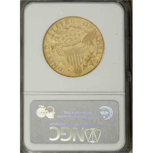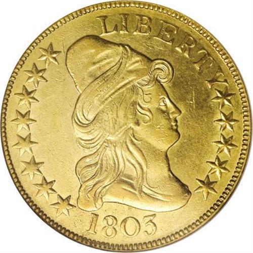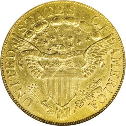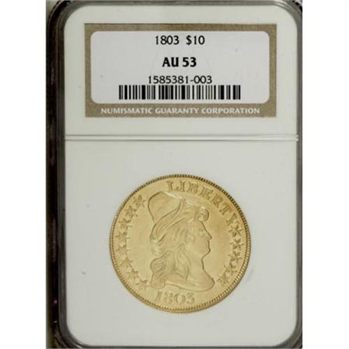<B>1803 $10 Small Stars Reverse AU53 NGC.</B></I> Breen-6844, Taraszka-28, BD-3, R.4. The obverse was used for all six of the different varieties for 1803, ranging from this R.4 pairing to the R.7 Large Stars Reverse, BD-6. On this Small Stars Reverse, the eagle's upper beak nearly touches a star right below its point, and the right bottom serif of the E in STATES is over a space between two clouds. This brilliant greenish-gold, problem-free example shows superior eye appeal and few singular distractions, save for a sole small tick in the right obverse field. This nice, high-end piece would fit well into a Mint State gold type set at a fraction of the Uncirculated price.<BR><BR><B>Coin Engraver:</B> Robert Scot<BR><BR><b>Shipping:</b> Coins & Currency (<a target="_blank" href="http://www.heritageauctions.com/common/shipping.php">view shipping information</a>)
