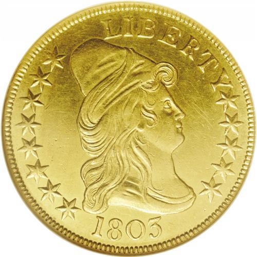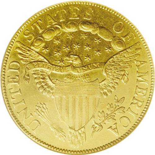 <B>1803<$10> Small Stars Reverse AU58 NGC.</B></I> Breen-6844, B. 1-A, Taraszka-28, R.4. This variety is most easily distinguished by the position of the E in STATES whose right edge is just over the space between the opening in the clouds. This is also the famous "Horned Eagle" variety that shows die clash marks above the eagle's head that resemble a pair of horns. The striking details are remarkably strong except, of course, for star 4 on the reverse which is diagnostically weak. The fields impart a semi-reflective finish as the coin tilts under a light. There are no large or mentionable abrasions on either side, but there are a few minor marks in the right obverse field. An important type coin.