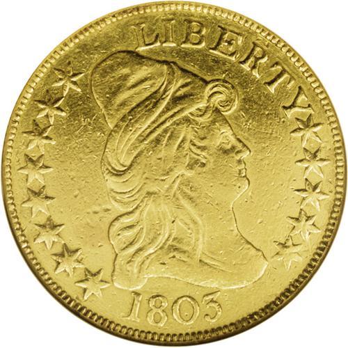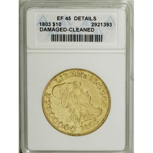 <B>1803 $10 Small Stars Reverse--Damaged, Cleaned--ANACS. XF45 Details.</B></I> Breen-6844, Taraszka-28, BD-3, R.4. A bright canary-gold representative with glossy and abraded fields. Substantial luster illuminates the borders and devices. Despite six different die varieties are known, the 1803 is a better date among Heraldic Eagle tens, noticeably scarcer than the 1799 or 1801.<BR><BR><b>Shipping:</b> Coin/Currency (<a target="_blank" href="http://www.heritageauctions.com/common/shipping.php">view shipping information</a>)
