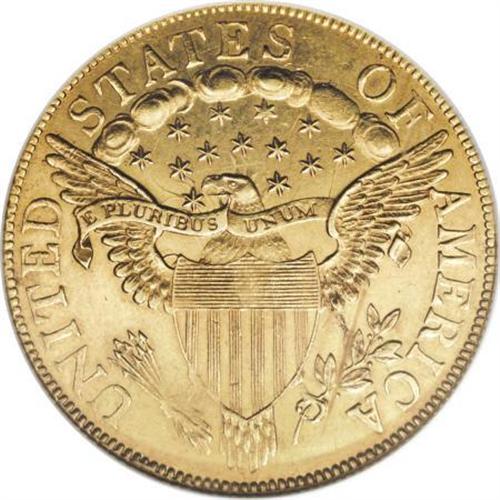 <B>1803 $10 Small Stars Reverse MS60 NGC.</B></I> Breen-6844, Taraszka-28, BD-3, R.4. This impressive apricot-gold representative is surprisingly free from abrasions, and the strike is crisp aside from the eagle's left (facing) claw. The centers are unusually well brought up, particularly the breast feathers and the hair near the ear. The obverse has light peripheral adjustment marks, as produced, but the eye appeal is exceptional for the grade. Clash marks from the curls surround the eagle's beak. The reverse side of the holder has a vertical mark that appears in the images without any effect on the coin itself. An opportunity for the alert early gold specialist.<BR><BR><B>Coin Engraver:</B> Robert Scot<BR><BR><b>Shipping:</b> Coins & Currency (<a target="_blank" href="http://www.heritageauctions.com/common/shipping.php">view shipping information</a>)