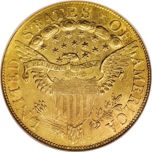 <B>1803 $10 Small Stars Reverse MS61 NGC.</B></I> Breen-6844, Taraszka-28, BD-3, R.4. In addition to the smaller sized obverse stars, this variety is also attributable by the position of the E in STATES which is almost entirely left of the break in the clouds. Of the six varieties of 1803 tens, this is the most frequently seen die combination. The 1803 is a scarcer date among early tens. Of the 15,017 pieces believed to have been struck of this date, more than half (7500-10,000 pieces) are believed to have been of the BD-3 variety. However, as with all early gold, attrition took a heavy toll. Today the most reliable estimate is that 150-200 pieces are extant of this die variant (making it an R.4). The Dannreuther-Bass reference mentions that only 93 auction appearances were recorded of this die marriage between 1990 and 2005.<BR> On this piece, one of the most immediately obvious elements are the strong striking details on each side. The hair curls are sharp and the breast feather definition is far above average for the type. That being said, the peripheral stars on the obverse do show some weakness. The coin is bright overall with yellow-gold color, and the fields display the often-seen semi-prooflikeness common to many early gold coins. There are a few shallow adjustment marks on the lower reverse that are worthy of mention, but these do not detract from the overall beauty of this important early ten.<BR><BR><b>Shipping:</b> Coins & Currency (<a target="_blank" href="http://www.heritageauctions.com/common/shipping.php">view shipping information</a>)