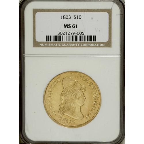<B>1803 $10 Small Stars Reverse MS61 NGC.</B></I> Breen-6844, Taraszka-28, BD-3, R.4. In addition to the smaller sized obverse stars, this variety is also attributable by the position of the E in STATES which is almost entirely left of the break in the clouds. Of the six varieties of 1803 tens, this is the most frequently seen die combination. The 1803 is a scarcer date among early tens. Of the 15,017 pieces believed to have been struck of this date, more than half (7500-10,000 pieces) are believed to have been of the BD-3 variety. However, as with all early gold, attrition took a heavy toll. Today the most reliable estimate is that 150-200 pieces are extant of this die variant (making it an R.4). The Dannreuther-Bass reference mentions that only 93 auction appearances were recorded of this die marriage between 1990 and 2005.<BR> On this piece, one of the most immediately obvious elements are the strong striking details on each side. The hair curls are sharp and the breast feather definition is far above average for the type. That being said, the peripheral stars on the obverse do show some weakness. The coin is bright overall with yellow-gold color, and the fields display the often-seen semi-prooflikeness common to many early gold coins. There are a few shallow adjustment marks on the lower reverse that are worthy of mention, but these do not detract from the overall beauty of this important early ten.<BR><BR><b>Shipping:</b> Coins & Currency (<a target="_blank" href="http://www.heritageauctions.com/common/shipping.php">view shipping information</a>)