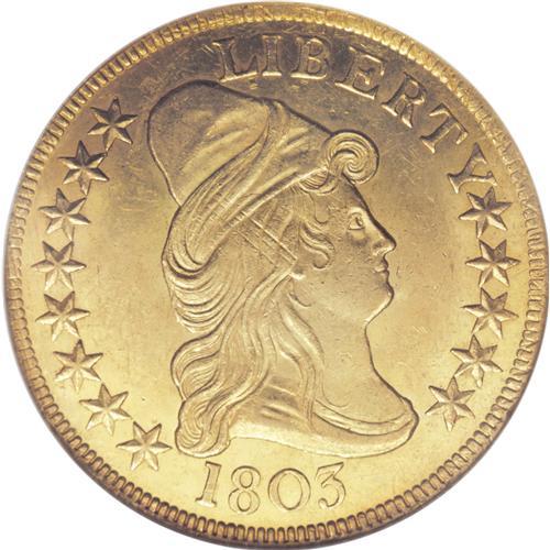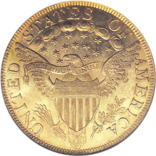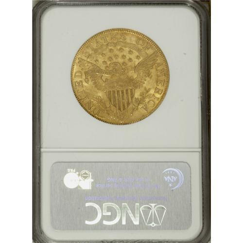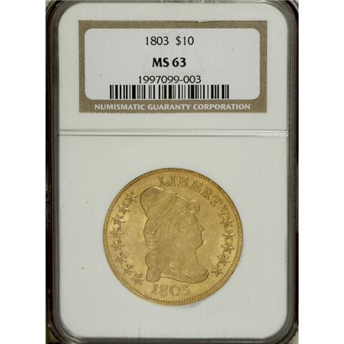 <B>1803 $10 Small Stars Reverse MS63 NGC.</B></I> Breen 1-D, Taraszka-26, BD-1, High R.5. Six known varieties of 1803 eagles were coined from a single obverse die, combined with six different reverse dies. A number of similar occurrences within all denominations combine one die with multiple partners. The single die (sometimes called a workhorse die) is almost always the obverse, although there are exceptions. A single 1794 large cent reverse was coupled with six different obverse dies for example. Possibly the most famous exception is the Small Eagle silver dollar reverse die that was mated with six different obverse dies spanning four different years.<BR> This particular variety, with a total estimated population of just over 30 coins, is an important rarity in the series of early eagle varieties. In his years of collecting, Harry Bass was only able to acquire one example, a coin that is on display at the American Numismatic Association in Colorado Springs, and probably the only piece that exceeds this example for quality. This example has sharp details on both sides, with brilliant and highly lustrous green-gold frost. The central obverse and the left border of the obverse each have light adjustment marks that occurred when the weight of the planchet was being fine tuned before it was struck. A few minor abrasions on each side of this piece serve to limit the grade and yet the overall eye appeal is exceptional, being enhanced by pale orange toning toward the borders. NGC has only certified five finer examples of this date (4/07) while this example is probably the second finest of the die variety.<BR><BR><b>Shipping:</b> Coins & Currency (<a target="_blank" href="http://www.heritageauctions.com/common/shipping.php">view shipping information</a>)