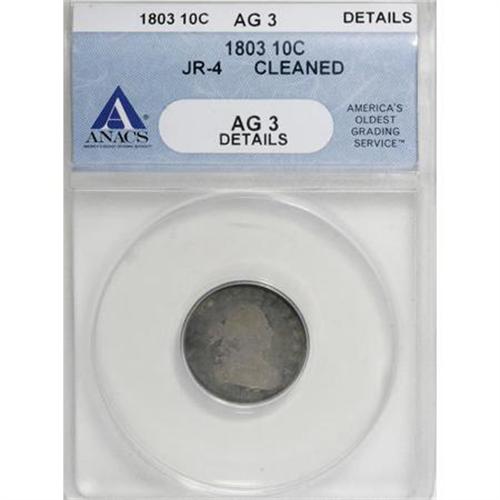 <B>1803 10C --Cleaned--ANACS. AG3 Details.</B></I> JR-4. NGC Census: (3/28). PCGS Population (5/35). Mintage: 33,040. Numismedia Wsl. Price for NGC/PCGS coin in AG3 : $336. (#4473)<BR><BR><B>Coin Engraver:</B> Robert Scot<BR><BR><b>Shipping:</b> Coins & Currency (<a target="_blank" href="http://www.heritageauctions.com/common/shipping.php">view shipping information</a>)