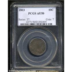 <TABLE cellSpacing=0 cellPadding=0 width="100%" bgColor=#000000 border=0><TBODY><TR><TD width="100%"><TABLE cellSpacing=1 cellPadding=3 width="100%" border=0><TBODY><TR><TD width="100%" bgColor=#79735c><FONT face=arial color=#ffffff size=3><B>Description</B> </FONT></TD></TR><TR><TD width="100%" bgColor=#ffffff><FONT face=arial size=2><B>1803 10C AU50 PCGS.</B></I> JR-3, R.4. Deep gunmetal and olive-gray surfaces with some streaky lightening on the reverse. The richness of the toning tends to mute the underlying luster. Several heavy die cracks are noted in the vicinity of the date between the border and the base of the portrait. </FONT></TD></TR></TBODY></TABLE></TD></TR></TBODY></TABLE><BR><A name=PricesRealized></A><TABLE cellSpacing=0 cellPadding=0 width="100%" bgColor=#000000 border=0><TBODY><TR><TD width="100%"><TABLE cellSpacing=1 cellPadding=3 width="100%" border=0><TBODY><TR><TD width="100%" bgColor=#79735c><A name=PR><FONT face=arial color=#ffffff size=3><B>Previous Prices from Heritage Auctions</B> </FONT></A></TD></TR><TR><TD bgColor=#f6f6ed><TABLE cellSpacing=0 cellPadding=0 width="100%" border=1><TBODY><TR><TD align=middle width="33%"><B>Date</B></TD><TD align=middle width="33%"><B>Service</B></TD><TD align=middle width="33%"><B>Price</B></TD></TR><TR bgColor=whitesmoke><TD width="33%"><B>08/07/1998</B></TD><TD width="33%">ANACS</TD><TD width="33%">$5,750.00</TD></TR></TBODY></TABLE></TD></TR><TR><TD bgColor=#ffffff><FONT face=arial size=1 ?>PLEASE NOTE: All prices realized reflect the final hammer price PLUS the buyer's premium in auctions that charge a buyer's premium. Each item has a notation at the top of the listing indicating whether that lot included a buyer's premium. Example: A item that sells with a final hammer price of $100 and a 20% buyer's premium will display with a price realized of $120. All information listed is intended to be as accurate as possible, but errors are possible. Please use this guide carefully and inform us of any inaccuracies. </FONT></TD></TR></TBODY></TABLE></TD></TR></TBODY></TABLE><BR><TABLE cellSpacing=0 cellPadding=0 width="100%" bgColor=#000000 border=0><TBODY><TR><TD width="100%"><TABLE cellSpacing=1 cellPadding=3 width="100%" border=0><TBODY><TR><TD width="100%" bgColor=#79735c colSpan=6><FONT face=arial color=#ffffff size=3><B>Price Guide*</B> </FONT></TD></TR><TR bgColor=#f6f6ed><TD align=middle><B>Grade</B> </TD><TD align=middle><B>Coin World<BR>(Trends)</B> </TD><TD align=middle><B>Numismedia<BR>Retail</B> </TD><TD align=middle><B>Numismedia<BR>Wholesale</B> </TD><TD align=middle><B>Coin<BR>Universe</B> </TD><TD align=middle><B>Heritage<BR>Value Index</B> </TD></TR><TR bgColor=#ffffff><TD align=middle>45</TD><TD align=right>---</TD><TD align=right>---</TD><TD align=right>---</TD><TD align=right>---</TD><TD align=right>$3,942.50</TD></TR><TR style="FONT-WEIGHT: bold" bgColor=#cccfdd><TD align=middle>50</TD><TD align=right>$8,000.00</TD><TD align=right>---</TD><TD align=right>$5,975.00</TD><TD align=right>---</TD><TD align=right>$5,230.00</TD></TR><TR bgColor=#ffffff><TD align=middle>53</TD><TD align=right>---</TD><TD align=right>---</TD><TD align=right>$6,450.00</TD><TD align=right>---</TD><TD align=right>$4,680.00</TD></TR><TR bgColor=#ffffff><TD colSpan=6><FONT size=1>*All information listed is intended to be as accurate as possible, but errors are possible. No item may be returned or refused based on this information which is provided as a service to our customers. You should contact each pricing source directly to determine the accuracy of this information. </FONT></TD></TR></TBODY></TABLE></TD></TR></TBODY></TABLE><BR><TABLE cellSpacing=0 cellPadding=0 width="100%" bgColor=#000000 border=0><TBODY><TR><TD width="100%"><TABLE cellSpacing=1 cellPadding=3 width="100%" border=0><TBODY><TR><TD width="100%" bgColor=#79735c><FONT face=arial color=#ffffff size=3><B>Population Guide</B> </FONT></TD></TR><TR bgColor=#ffffff><TD align=middle><!-- Begin Output of Population Grid--><TABLE cellSpacing=0 cellPadding=0 width="100%" border=0><TBODY><TR><TD vAlign=center><TABLE cellSpacing=0 width="100%" border=1 cellsadding="3"><TBODY><TR><TD vAlign=center><TABLE cellSpacing=0 cellPadding=3 width="100%" border=1><TBODY><TR><TD vAlign=center align=middle bgColor=#f0f1e8 colSpan=2 <CENTER><FONT face=Arial size=2><B>PCGS Pop </B></FONT><CENTER></CENTER></TD><TD vAlign=center align=middle bgColor=#f0f1e8 colSpan=2><CENTER><FONT face=Arial size=2><B>NGC Pop</B></CENTER></FONT></TD></TR><TR><TD vAlign=center><FONT face=Arial size=2>(50)</FONT> </TD><TD vAlign=center align=right><FONT face=Arial size=2>2</FONT> </TD><TD vAlign=center><FONT face=Arial size=2>(50)</FONT> </TD><TD vAlign=center align=right><FONT face=Arial size=2>0</FONT> </TD></TR><TR><TD vAlign=center><FONT face=Arial size=2>(>50)</FONT> </TD><TD vAlign=center align=right><FONT face=Arial size=2>4</FONT> </TD><TD vAlign=center><FONT face=Arial size=2>(>50)</FONT> </TD><TD vAlign=center align=right><FONT face=Arial size=2>5</FONT> </TD></TR></TBODY></TABLE></TD></TR></TBODY></TABLE></TD></TR></TBODY></TABLE><!-- End Output of Population Grid--> Important notice: Heritage usually auctions material at the rate of 200-250 lots per hour. On some occasions eBay Live bid software or the Internet may not be able to keep up with the pace of the auction. We recommend placing a realistic absentee bid now as insurance to avoid disappointment. Occasionally the auctioneer may eliminate or reject an eBay Live bid, and the auctioneer may also reopen a lot after the close of the eBay live bidding (usually because we missed an audience bid), and may reject your bid even if it shows you as the winning bidder. By bidding via eBay Live, you agree that Heritage may award the lot to another bidder at its sole discretion under the circumstances described above or any other reasonable circumstances. Also please note that all Heritage lots purchased through eBay Live carry a 20% Buyer's Premium. Please make s