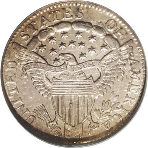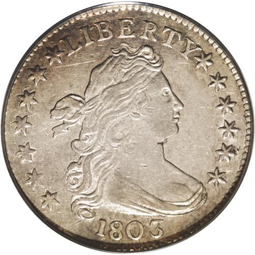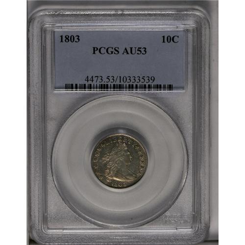 <B>1803<10C> AU53 PCGS.</B></I> JR-4, R.5. Among early dimes, this coinage date is considerably underrated. The authors of <I>Early United States Dimes</B></I> commented: "This rare dime date is probably the most unappreciated of the Draped Bust dime series." Today, five die varieties are known and three of those are major rarities. The most common variety is JR-3, which is currently rated R.4, and next is this R.5 variety.<BR> Although possibly not in the Condition Census for the variety, this example is clearly finer than most examples that we have seen. Both sides have light gray color with satiny luster and pale champagne overtones. Light surface marks on each side are visible, but not obtrusive. Surprisingly well struck for the grade with strong central obverse details and nearly full reverse details.<BR> The die state aficionado will love this coin! While the obverse die is essentially perfect without any noticeable die damage, the reverse die is shattered and extensively clashed. In fact, the reverse die looks to be in pieces, and one chunk in the right wing is missing altogether. The numismatist with an inclination for such puzzles may enjoy recording each of the individual die cracks and clash marks on the reverse.