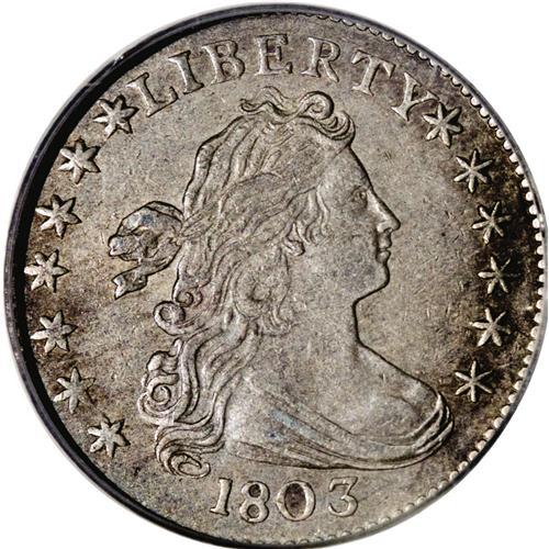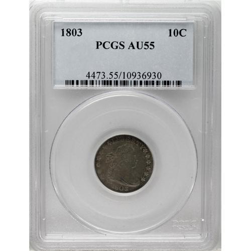 <B>1803 10C AU55 PCGS.</B></I> JR-4, R.5. The variety is attributed by the 3 in the date that tilts right, and has its top parallel to the bust; LIB closer than BERTY; the second T in STATES located over the left quarter of cloud 3; and star 12 that touches the ribbon. Both sides are bathed in bluish-gray and reddish-tan patina. The design features are well impressed, including nice definition in the obverse center, which is usually weak on this variety; the eagle's breast and wing feathers are bold. Diagnostic die cracks are visible on the right side of the reverse. A pleasing early dime.<BR><BR><b>Shipping:</b> Coin/Currency (<a target="_blank" href="http://www.heritageauctions.com/common/shipping.php">view shipping information</a>)