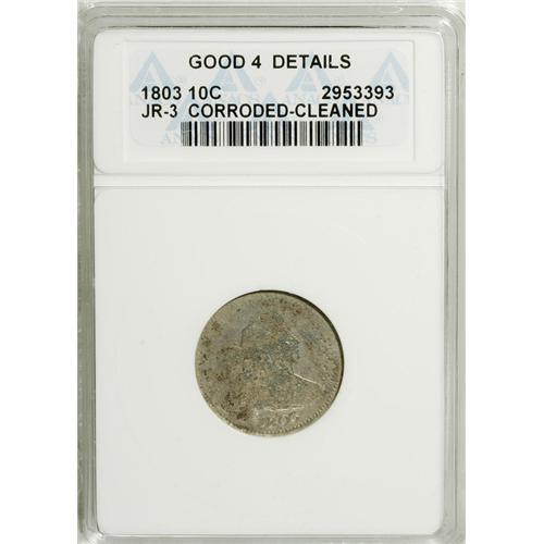 <B>1803 10C --Cleaned, Corroded--ANACS. Good 4 Details.</B></I> JR-3. NGC Census: (2/40). PCGS Population (0/29). Mintage: 33,040. Numismedia Wsl. Price: $450. (#4473)<BR><BR><b>Shipping:</b> Coins & Currency (<a target="_blank" href="http://www.heritageauctions.com/common/shipping.php">view shipping information</a>)