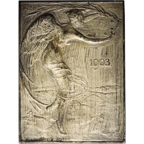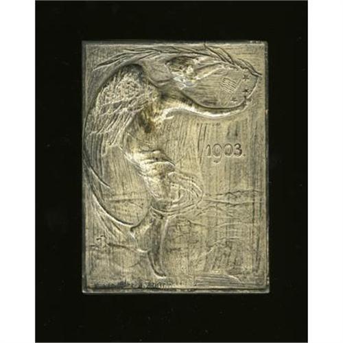 <B>1803-1903 Commemorative Plaque Silver/Bronze</B></I> Silver-plated bronze, 59 mm x 80 mm. Commemorates the 100th anniversary of some event, 1803-1903. Believed struck at the Paris Mint. Features a group of men meeting on a street somewhere (possibly Paris) with the date 1803 at the bottom. The reverse has a winged angel holding a shield with the date 1903 below. The plaque is signed on both sides: S. Burger Bartmann.<BR><BR><b>Shipping:</b> Coins & Currency (<a target="_blank" href="http://www.heritageauctions.com/common/shipping.php">view shipping information</a>)
