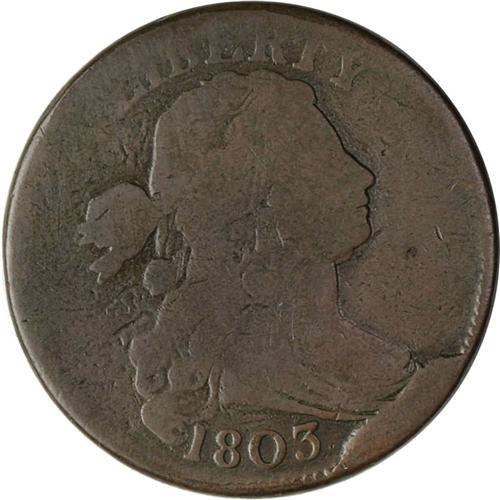 <B>1803<1C> 100/000. S-249, B-7, R.2. Good 4 NGC. Good 5 EAC.</B></I> Die State VI. Breen calls both Die State V and this die state, almost certainly the terminal one, "very rare." On the obverse a break that developed along the rim now extends about 30 degrees in each direction, coming close to the 3 in the date and touching the drapery. On the reverse a large rim break extends downward to cover the tops of RIC. Both of these breaks are so severe that they certainly appear as though they were loose, or about to work loose and break off of the dies. This medium-brown coin, graded Good 4, appears to have been struck from dies that were also axially misaligned, so that there is weakness in the details at the top of each side that appear to be only Fair, while the bottoms (the date and the corrected fraction, respectively) have the detail of Very Good or a bit better. Finally, the reverse die is rotated about 30 degrees counterclockwise. An interesting and affordable specimen that gives considerable insight into the workings of our nation's first Mint during its early years.<BR><I> Ex: William R.T. Smith (8/24/1977).</B></I> Envelope Included.