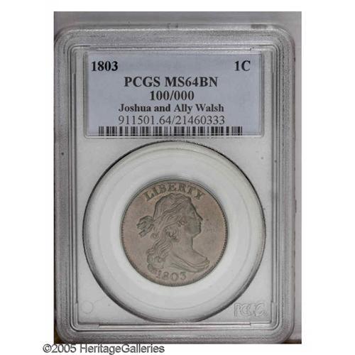 <B>1803<1C> 100/000 MS64 Brown PCGS.</B></I> S-249, R.2. BDS IV. A distinctive variety; not only does Sheldon-249 have an obvious corrected denominator, but a prominent die lump is present beneath the chin. This well struck piece is chocolate-brown in color aside from aqua tints within protected areas of the reverse. A shallow planchet flaw in front of the profile is of mint origin. The obverse is splendidly preserved, as is the reverse save for several thin vertical marks near the E in CENT and the O in ONE.<BR><I>From The Joshua and Ally Walsh Collection of United States Cents.</B></I>