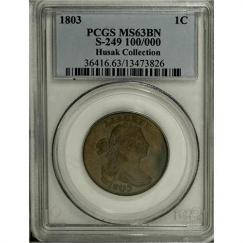 <B>1803 1C Corrected Fraction. MS63 Brown PCGS. S-249, B-7, R.2.</B></I> <B>Bland MS61; tied for CC-3. Noyes MS62; CC-3. Photo #20614. Our EAC Grade MS60.<BR><BR>Equivalents. </B></I>Proskey 1; Doughty 179; McGirk 1A; Ross 1; Newcomb 7; EAC 7; <I>Encyclopedia </B></I>1752; PCGS #911501.<BR><B><BR>Variety. </B></I>Small Date. "Mumps" variety, die chip at throat. Corrected Fraction. The obverse appears on S-246, S-247, S-248, and S-249. The reverse appears on S-249.<BR><B><BR>Surfaces.</B></I> The obverse has intermingled olive, golden-tan, and steel, and the reverse is darker steel-brown and olive. A pleasing, lustrous example with essentially mark-free surfaces.<BR><B><BR>Die State II. </B></I>Light clash marks with a tiny bulge at the end of the drapery.<BR><B><BR>Provenance. </B></I><I>David Proskey; Henry C. Hines; Dr. William H. Sheldon (4/1972); R.E. Naftzger, Jr.; Auction '81 (Paramount), lot 1054, $4,500; R.E. Naftzger, Jr. (2/1992); Eric Streiner (1/1994); Chris Victor-McCawley.</B></I><BR><BR><B>Personality. </B></I>Although his ethics have been questioned in recent years, there is no doubt that <B>Dr. William H. Sheldon </B></I>did more to expand the interest of large cent collecting than any other individual. <BR><BR>Sheldon was born in Warwick, Rhode Island, on November 19, 1898, and died in Cambridge, Massachusetts, on September 16, 1977.<BR><BR>While continuing his education through the University of Chicago, he worked in a variety of professions. At different times during his life, he was an oilfield scout, a wolf hunter (for a sheep ranch in New Mexico), a high school teacher, a college instructor and professor, and a Harvard research associate. He served in both World War I and World War II, first as a second lieutenant in the Army and later with the U.S. Army Medical Corps.<BR><BR>His most important contributions to numismatics were his reference <I>Early American Cents</B></I> (later editions were known as <I>Penny Whimsy</B></I>) and development of the 70-point grading scale that is known to nearly every collector today. He was also the author of several books in the field of psychology. Dr. Sheldon assembled a collection of early large cents including all 295 of his numbered varieties and 30 additional "non-collectible" varieties. This collection was sold intact to R.E. Naftzger, Jr. on April 19, 1972.<BR><BR><b>Shipping:</b> Coins & Currency (<a target="_blank" href="http://www.heritageauctions.com/common/shipping.php">view shipping information</a>)