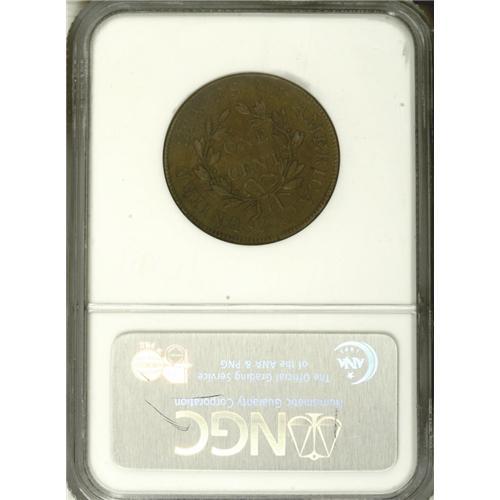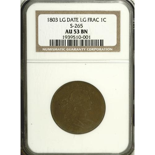 <B>1803 1C Large Date, Large Fraction AU53 NGC.</B></I> S-265, R.3. A scarce variety and one of the keys needed for anyone completing a set of cents from 1803. The surfaces of this piece are exceptionally smooth, a factor that is not usually seen on most old coppers. The striking details on the obverse are well defined, with complete detailing on the hair curls of Liberty. The reverse, however, shows some minor softness on the leaves. Slight surface disturbances appear at the lower part of the bust. Struck a bit off-center on each side. The obverse shows full dentilation, but the upper reverse lacks several denticles, and there is slight striking softness in the same area. EAC 20.<BR><BR><b>Shipping:</b> Coins & Currency (<a target="_blank" href="http://www.heritageauctions.com/common/shipping.php">view shipping information</a>)