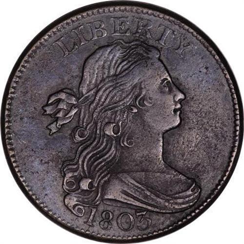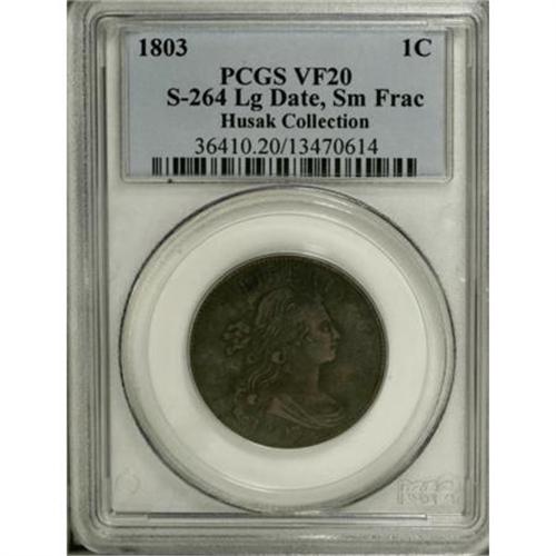 <B>1803 1C Large Date, Small Fraction. VF20 PCGS. S-264, B-24, High R.4.</B></I> <B>Bland VF20; tied for CC-2. Noyes VF25; CC-3. Photo #23264. Our EAC Grade VF20.<BR><BR>Equivalents. </B></I>McGirk 14E; Ross 20; Newcomb 23; EAC 23; <I>Encyclopedia </B></I>1759; PCGS #1497.<BR><B><BR>Variety. </B></I>Large Date, pointed 1. Small Fraction. Six berries left. The obverse appears on S-264 and S-265. The reverse appears on S-263 and S-264.<BR><B><BR>Surfaces.</B></I> The sharpness is slightly finer, with dark steel and olive color, the devices lighter brown. The surfaces show microscopic roughness with some minor encrustation. The obverse has a few faint scratches and a small rim bruise at 4 o'clock. Like so many early coppers, the coin possesses better aesthetic appeal than the description suggests.<BR><BR><B>Die State II. </B></I>The Large Date obverse is the third 1803 obverse with an arc crack at the lower left, on this example through the digit 1 to the lower hair ribbon, and the border, but it is not the die of S-258. A second, nearly horizontal crack crosses the bust just below the neck. The reverse has several cracks, but the die state is early for this combination, with no indication of a retained cud.<BR><BR><B>Appearances. </B></I>The obverse and reverse are illustrated in Breen's <I>Large Cent Encyclopedia</B></I>.<BR><BR><B>Commentary. </B></I>The famous "Large Date, Small Fraction" variety. According to Del Bland, this coin was found by Dr. Sartoris among unattributed coins in Charles French's "junk box." Quite some junk that box contained.<BR><BR><B>Provenance. </B></I><I>French's (1954); Dr. Kenneth J. Sartoris (5/1972); Del N. Bland (5/1972); C. Douglas Smith (12/1977); Denis W. Loring (10/1979); C. Douglas Smith; Dr. Robert A. Schuman; Superior (6/2000), lot 235, $31,050.</B></I><BR><BR><B>Personality. Dr. Kenneth J. Sartoris</B></I> (1908-1978) was a physician in Schenectady, New York. His collection was cataloged by John Adams, Del Bland, and Denis Loring, and sold privately in 1982.<BR><BR><b>Shipping:</b> Coins & Currency (<a target="_blank" href="http://www.heritageauctions.com/common/shipping.php">view shipping information</a>)
