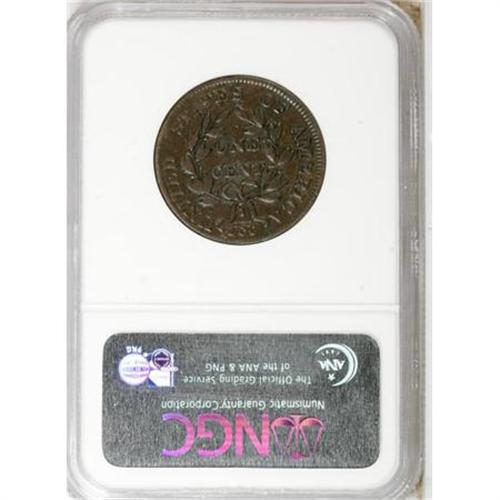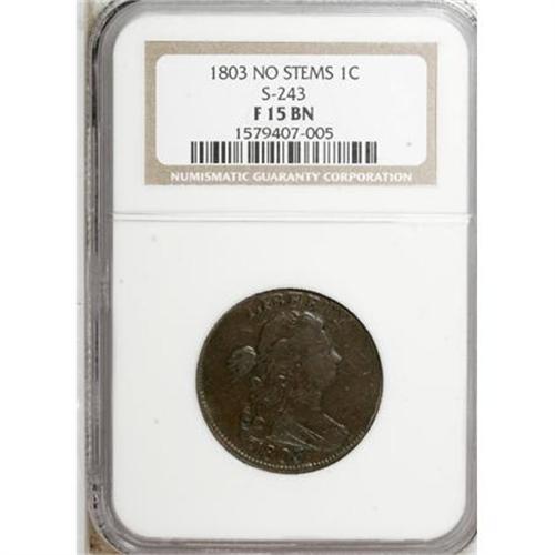 <B>1803 1C No Stems Fine 15 NGC.</B></I> S-243, B-1, R.2. Easily attributable by the extra S below the second S in STATES, the double fraction bar, and the lack of stems. There is a rim break at TY of LIBERTY. Medium brown surfaces display well defined design elements. The reverse is quite clean, while the obverse reveals a few scattered minute contact marks. Overall, a nice early large cent. EAC 10.<BR><BR><b>Shipping:</b> Coins & Currency (<a target="_blank" href="http://www.heritageauctions.com/common/shipping.php">view shipping information</a>)