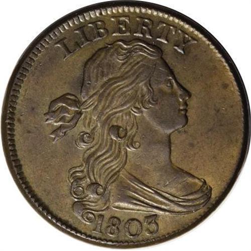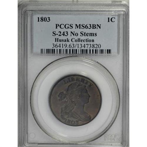 <B>1803 1C No Stems. MS63 Brown PCGS. S-243, B-1, R.2.</B></I> <B>Bland MS60; CC-5. Noyes AU55; CC-5. Photo #23089. Our EAC Grade AU55.<BR><BR>Equivalents. </B></I>Proskey 2; Doughty 180; McGirk 2A; Ross 2; Newcomb 1; EAC 1; <I>Encyclopedia </B></I>1751; PCGS #921501.<BR><B><BR>Variety. </B></I>Small Date. Missing hair above 1. No stems, doubled S and fraction bar. The obverse appears on S-243. The reverse appears on 1802 S-241 and 1803 S-243.<BR><B><BR>Surfaces.</B></I> Gorgeous surfaces and mostly sharp design features, although the leaves are flat as always. Both sides have excellent luster with splendid olive and chestnut color. Hints of darker chocolate-brown highlight the devices. Each side has a few scattered surface marks.<BR><B><BR>Die State I. </B></I>Faint clash marks on each side, most noticeable above MERIC.<BR><B><BR>Appearances. </B></I>The obverse and reverse are illustrated in Breen's <I>Large Cent Encyclopedia</B></I>.<BR><BR><B>Commentary. </B></I>This is an excellent year for the novice variety collector. There are 24 varieties currently identified, and only two are considered rare. These 24 die combinations represent six major types, including the Stemless Wreath offered here.<BR><BR><B>Provenance. </B></I><I>George L. Davis (Stack's, 4/1954), lot 1614, $190; C. Douglas Smith; Louis Helfenstein; C. Douglas Smith; Dr. Robert A. Schuman; Superior (6/2000), lot 206, $10,062.50; Anthony Terranova and Chris Victor-McCawley.</B></I><BR><BR><B>Personality. Louis Helfenstein</B></I> was a staff attorney for the Consolidated Mutual Insurance Company in New York City. He was born on July 15, 1906, and died on January 10, 1978. C. Douglas Smith introduced Helfenstein to large cents, and he went on to form an amazing collection of high-quality pieces. Of his 332 coins that Lester Merkin sold in August 1964, 319 graded Mint State.<BR><BR><b>Shipping:</b> Coins & Currency (<a target="_blank" href="http://www.heritageauctions.com/common/shipping.php">view shipping information</a>)