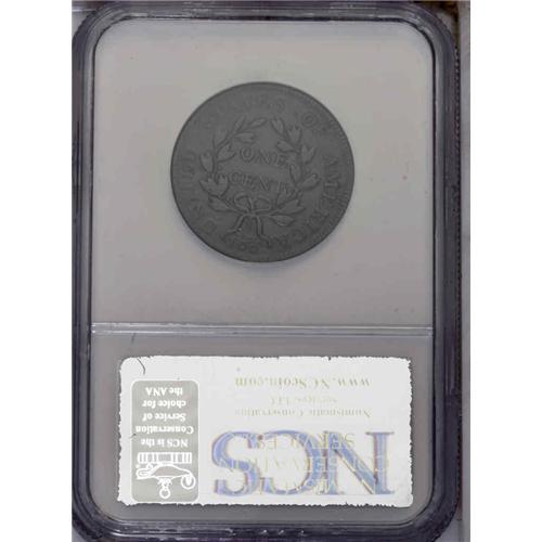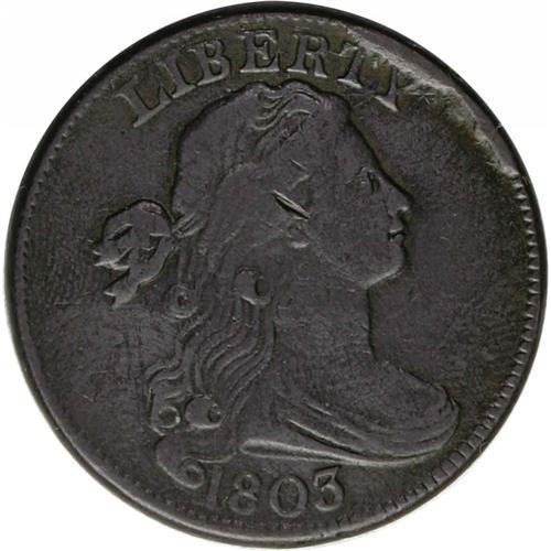 <B>1803<1C> No Stems. S-243, B-1, R.2--Improperly Cleaned--NCS. VF Details.</B></I> S-243. B-1, R.2. Die State V. Stemless reverse, with a "bald spot" in the hair above 1 in the date. On this late die state, a break above TY merges with a second break further to the right. The break above TY covers a portion of those letter tops. The second, lumpy break to the right covers the rim for a length of about eight dentils. While scant evidence remains right of TY from a clash with RIC on the reverse, there are numerous clashes prominent in the obverse fields from the reverse leaves. Axial die misalignment causes weakness at the obverse lower left quadrant, and on the reverse at D STA and nearby leaves. The surfaces are a glossy dark brown, with few distractions. Perusal with a glass reveals a not overly distracting cut in Liberty's hair, just above her ear.<BR><I>Ex: George Ramont (3/21/1972).</B></I> Envelope Included.