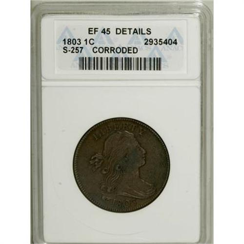 <B>1803 1C Small Date, Large Fraction--Corroded--ANACS. XF45 Details.</B></I> S-257, B-16, R.2. A sharply detailed Draped Bust cent whose golden-brown and steel-blue surfaces are mildly to moderately porous. Small marks are found on the obverse at 3 o'clock on the reverse near 6 o'clock. EAC 15.<BR><BR><b>Shipping:</b> Coins & Currency (<a target="_blank" href="http://www.heritageauctions.com/common/shipping.php">view shipping information</a>)