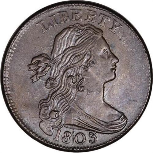 <B>1803 1C Small Date, Large Fraction. AU58 PCGS. S-261, B-20, R.2.</B></I> <B>Bland AU55; tied for CC-2. Noyes XF40; CC-9. Photo #23146. Our EAC Grade XF45.<BR><BR>Equivalents. </B></I>Proskey 18; Doughty 196; McGirk 19A; Ross 18; Newcomb 19; EAC 20; <I>Encyclopedia </B></I>1757; PCGS #1485.<BR><B><BR>Variety. </B></I>Small Date. Wide date, 3 buried in drapery. Large Fraction. Long fraction bar. The obverse appears on S-261. The reverse appears on S-260 and S-261.<BR><B><BR>Surfaces.</B></I> Olive and dark brown surfaces are accompanied by deep steel toning spots on the obverse, and considerable brick red patina on the reverse, with some very light corrosion. The surfaces on both sides are moderately abraded. Sharply struck with strong detail and complete borders.<BR><B><BR>Die State IV. </B></I>The arc crack through the lower left part of the obverse is fully developed with buckling behind the lower curls. This die state is similar to that of S-258, but starts between the 8 and 0, rather than through the 1 as on the other variety.<BR><B><BR>Appearances. </B></I>The obverse is illustrated in Newcomb and Noyes (1991). The obverse and reverse are illustrated in Breen's <I>Large Cent Encyclopedia.</B></I><BR><BR><B>Provenance. </B></I><I>Howard R. Newcomb (J.C. Morgenthau, 2/1945), lot 445, $10; James G. Macallister; Charles Green (1950); C. Douglas Smith; Dr. Robert A. Schuman; Superior (9/2004), lot 569, $6,325.</B></I><BR><BR><B>Personality. Charles Green</B></I> and his wife Ruth, operated a coin business under the name R. Green. They also operated the Numismatic Book Shop in Chicago. Charles Elmore Green was born April 7, 1894. He was a veteran of World War I who spent five years in a veteran's hospital recovering from injuries. The couple conducted nine auctions between 1941 and 1954. Green compiled a <I>Mint Record and Type Table of United States Coins</B></I> and served as a contributor to the <I>Handbook of United States Coins</B></I> (the Blue Book). He and his wife also reprinted Crosby's <I>Colonial Coins of America</B></I>. Charles Green died on December 21, 1955; Ruth died on February 10, 1979.<BR><BR><b>Shipping:</b> Coins & Currency (<a target="_blank" href="http://www.heritageauctions.com/common/shipping.php">view shipping information</a>)