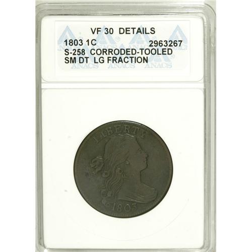 <B>1803 1C Small Date, Large Fraction--Corroded, Tooled--ANACS. VF30 Details.</B></I> S-258. NGC Census: (1/8). PCGS Population (8/44). Numismedia Wsl. Price for NGC/PCGS coin in VF30: $410. (#1485)<BR><BR><b>Shipping:</b> Coins & Currency (<a target="_blank" href="http://www.heritageauctions.com/common/shipping.php">view shipping information</a>)