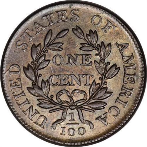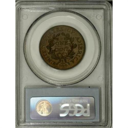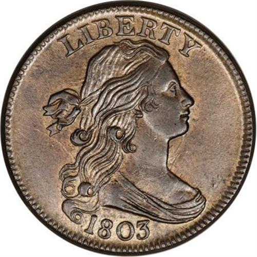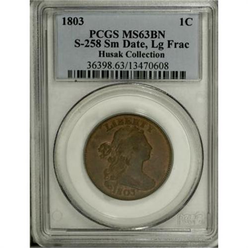 <B>1803 1C Small Date, Large Fraction. MS63 Brown PCGS. S-258, B-17, R.1.</B></I> <B>Noyes MS60; tied for CC-4. Photo #21459. Our EAC Grade AU55.<BR><BR>Equivalents. </B></I>Proskey 15; Doughty 193; McGirk 16A; Ross 15; Newcomb 16; EAC 17; <I>Encyclopedia </B></I>1757; PCGS #1485.<BR><B><BR>Variety. </B></I>Small Date. T repunched at left upright. Large Fraction. Die cut at curve of D. The obverse appears on S-257 and S-258. The reverse appears on S-258 and S-259.<BR><B><BR>Surfaces. </B></I>Fully lustrous with golden-brown and olive surfaces. Considerable faded mint red is evident, especially on the obverse, with nearly complete cartwheels on each side. A few minute blemishes are present, but none are singularly significant.<BR><B><BR>Die State III. </B></I>The obverse has an arc crack through the 1 and lower hair details, to the left border behind the hair ribbon. The bulge of State IV has not formed.<BR><B><BR>Commentary.</B></I> Sheldon-258 and S-260, both Rarity-1 varieties, are the two commonest Large Fraction varieties, important coins for Guide Book variety collectors.<BR><B><BR>Provenance. </B></I><I>Jerry A. Bobbe (1986); R.E. Naftzger, Jr.; Early American Coppers (4/1989), lot 147, $5,500; JBM; Early American Coppers (4/2001), lot 291, $6,050.</B></I><BR><B><BR>Personality. Jerry A. Bobbe</B></I> was born in Chicago in 1949 and resides in Portland, Oregon where he is a professional cellist. He also deals in coins with a specialty in Conder tokens. His collection of choice Mint State and proof cents was sold privately from 1979 to 1981.<BR><BR><b>Shipping:</b> Coins & Currency (<a target="_blank" href="http://www.heritageauctions.com/common/shipping.php">view shipping information</a>)